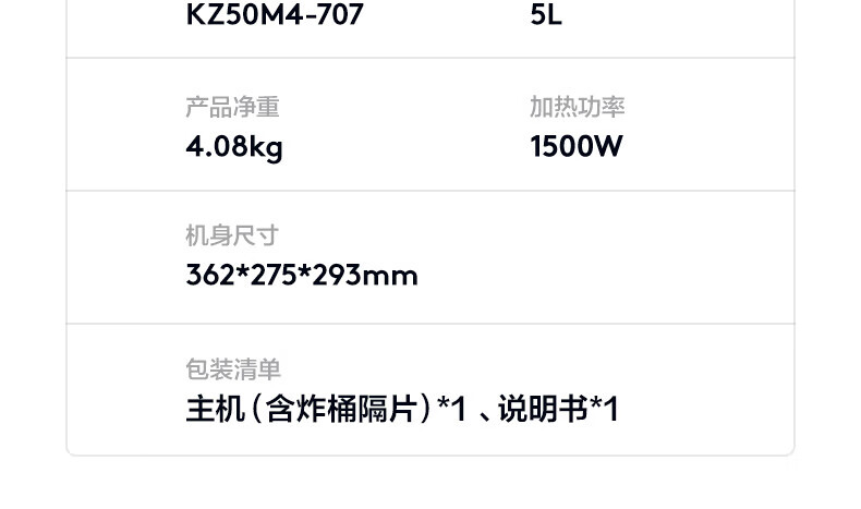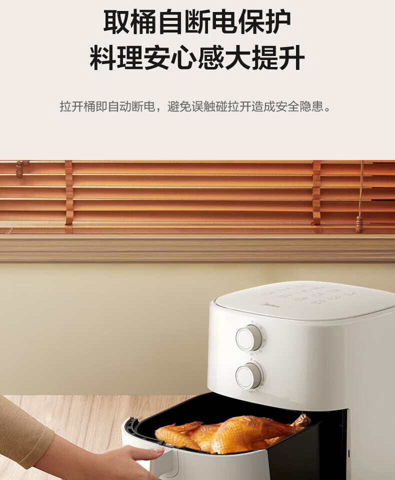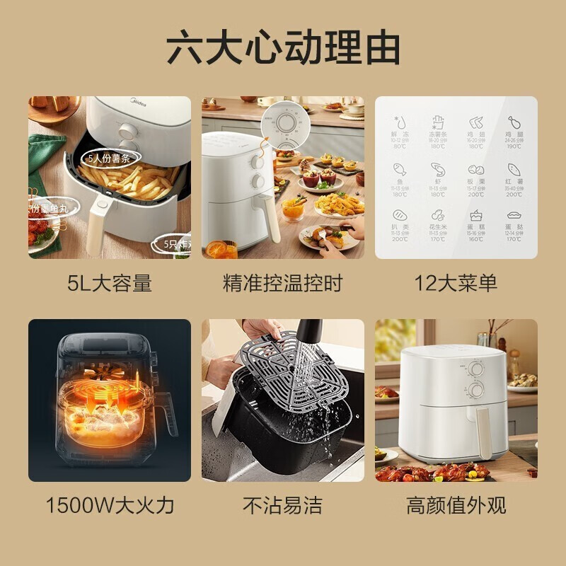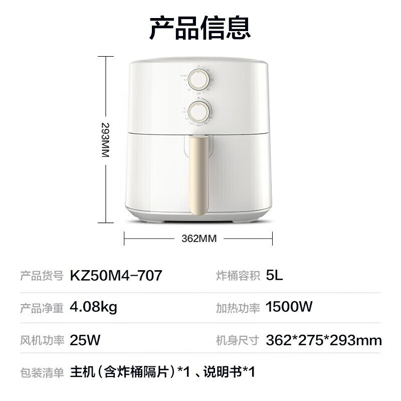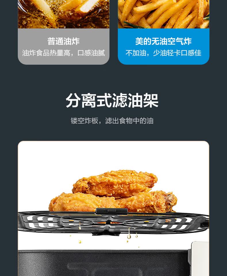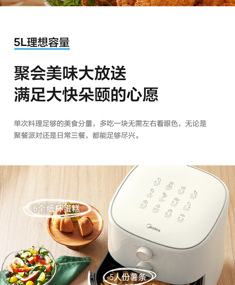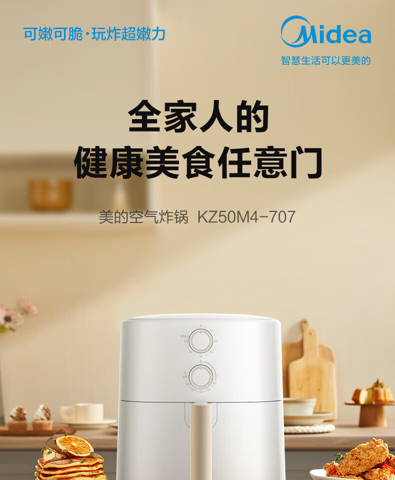 美的(Midea)5L空气炸锅MF-KZ50M4-707大容量家用多功能 低油轻脂 精准控温大功率电炸锅烤箱薯条机KZ50M4-707