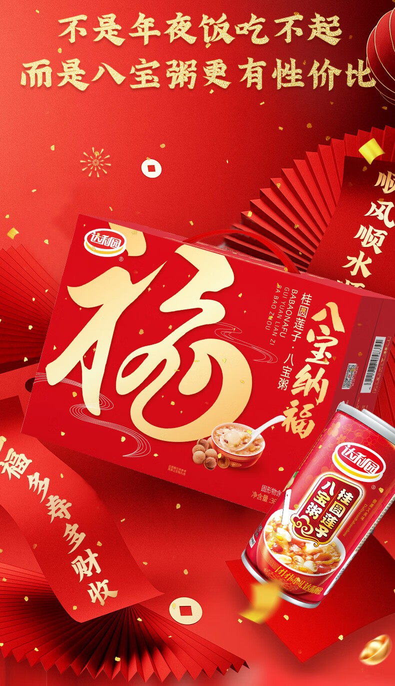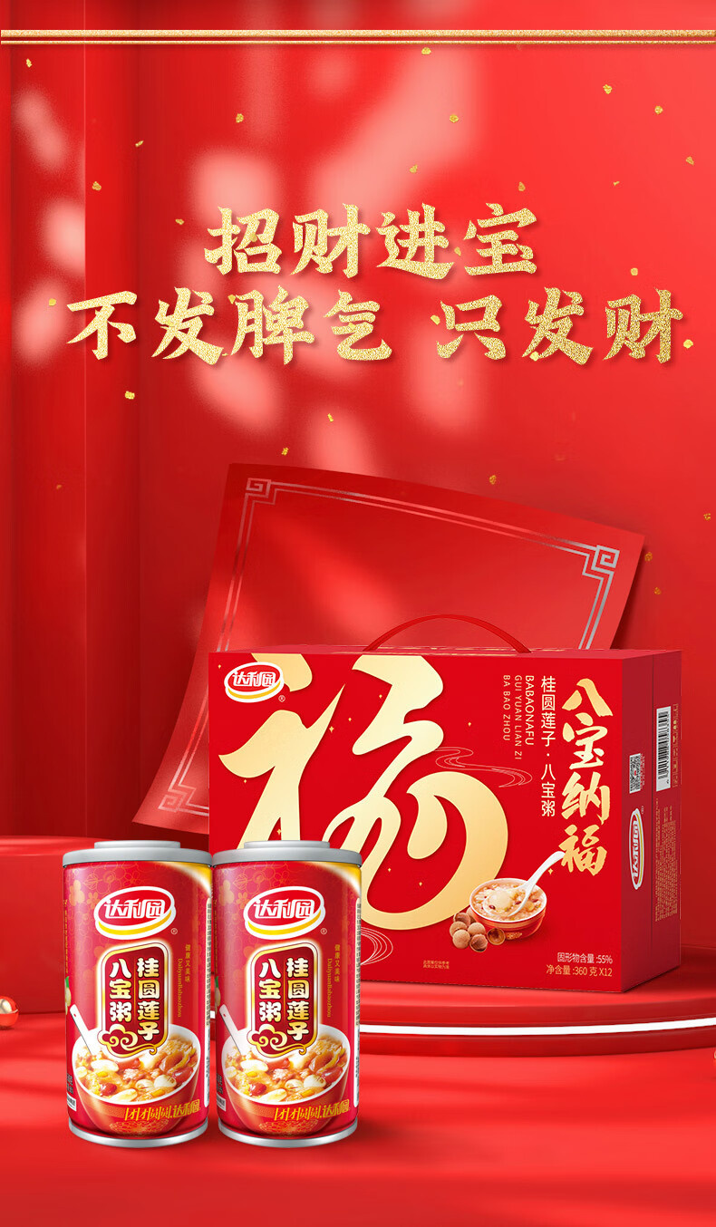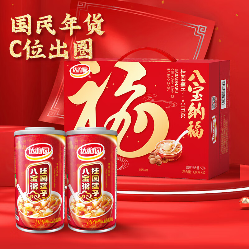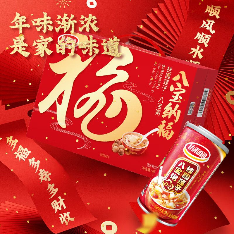 • 包装清单: 360g*12罐达利园罐装桂圆莲子八宝粥礼盒(电商)× 1