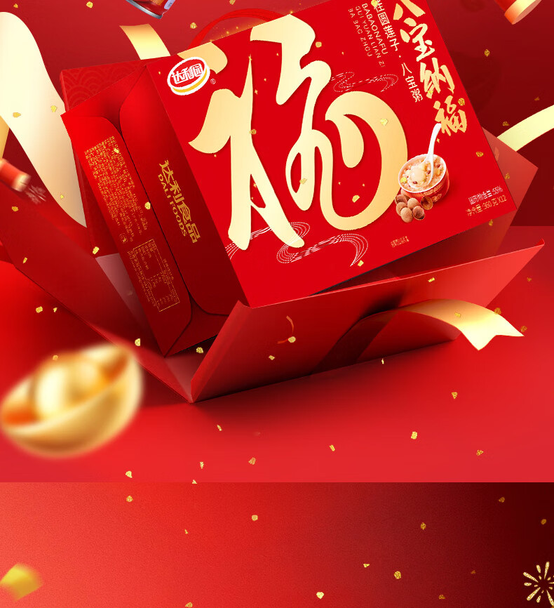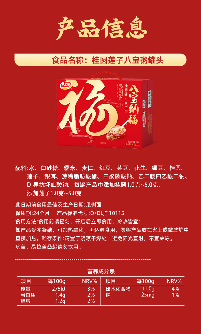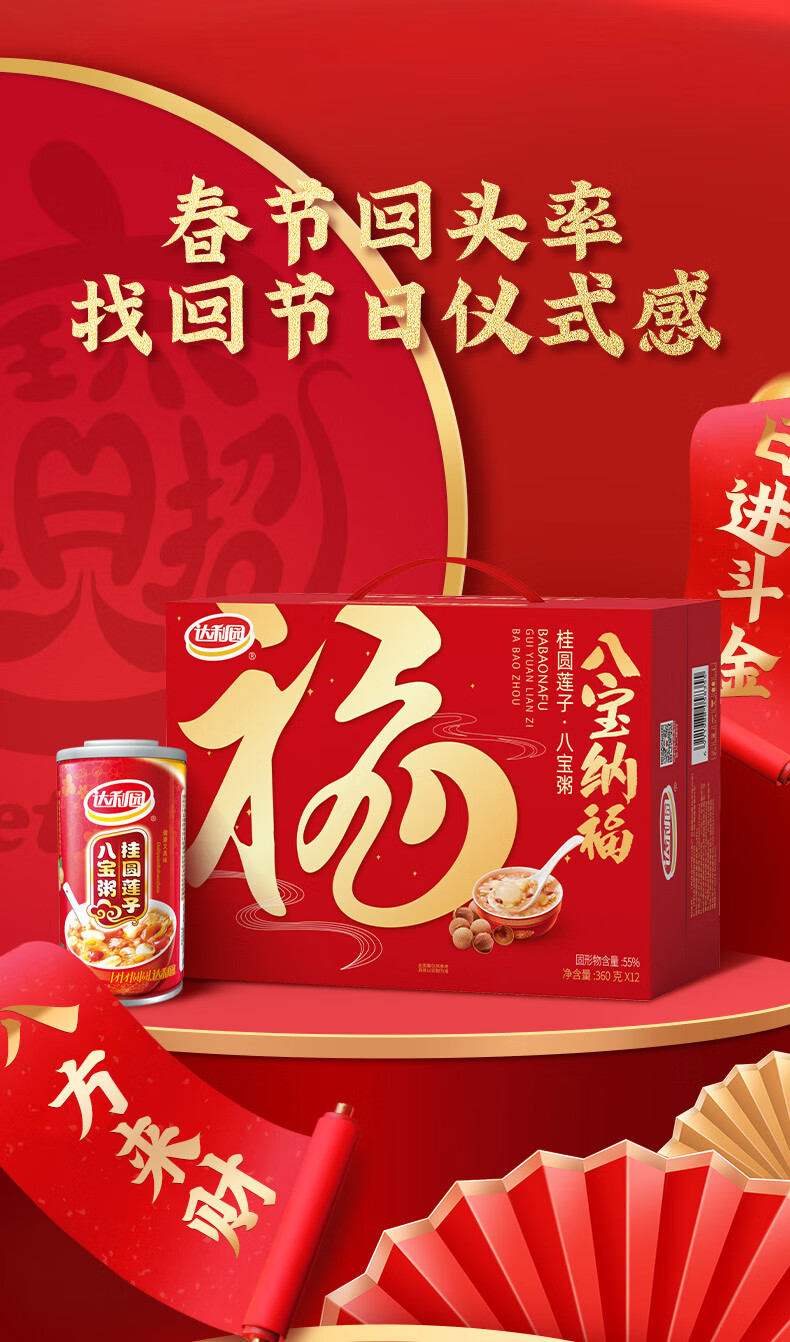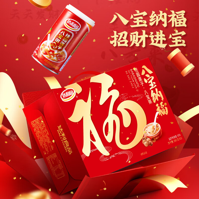 • 包装清单: 360g*12罐达利园罐装桂圆莲子八宝粥礼盒(电商)× 1